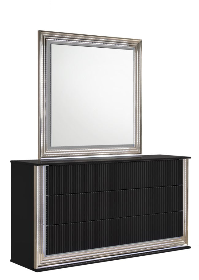 The Aspen Black Dresser and Mirror combines sophisticated design with practical storage solutions. This striking piece features a sleek black finish that complements contemporary and transitional interiors. The spacious dresser offers multiple drawers for organized clothing storage, while the coordinating mirror provides both functional reflection and visual balance. Quality construction ensures durability, making this an investment piece that anchors your bedroom with understated elegance and timeless appeal.
