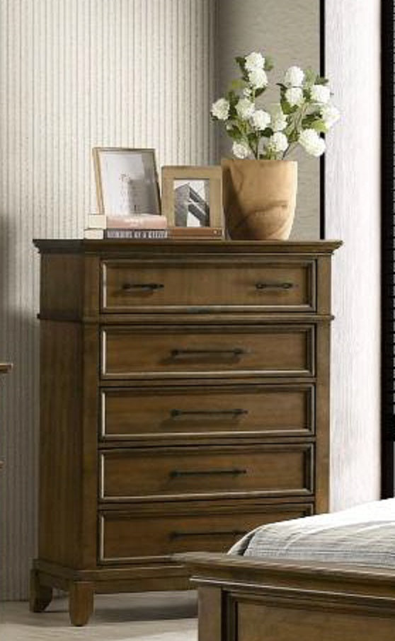 A perfect anchor piece for your master suite, this grand bedroom commands attention. With bold details and intricate crown molding accents, the large, panel style headboard towers over the wooden rubber wood bed frame. Similar crown molding motifs can be found on the case goods. On the hardware side of things, the rustic-inspired appliance bar pulls are finished in a shade of pewter.