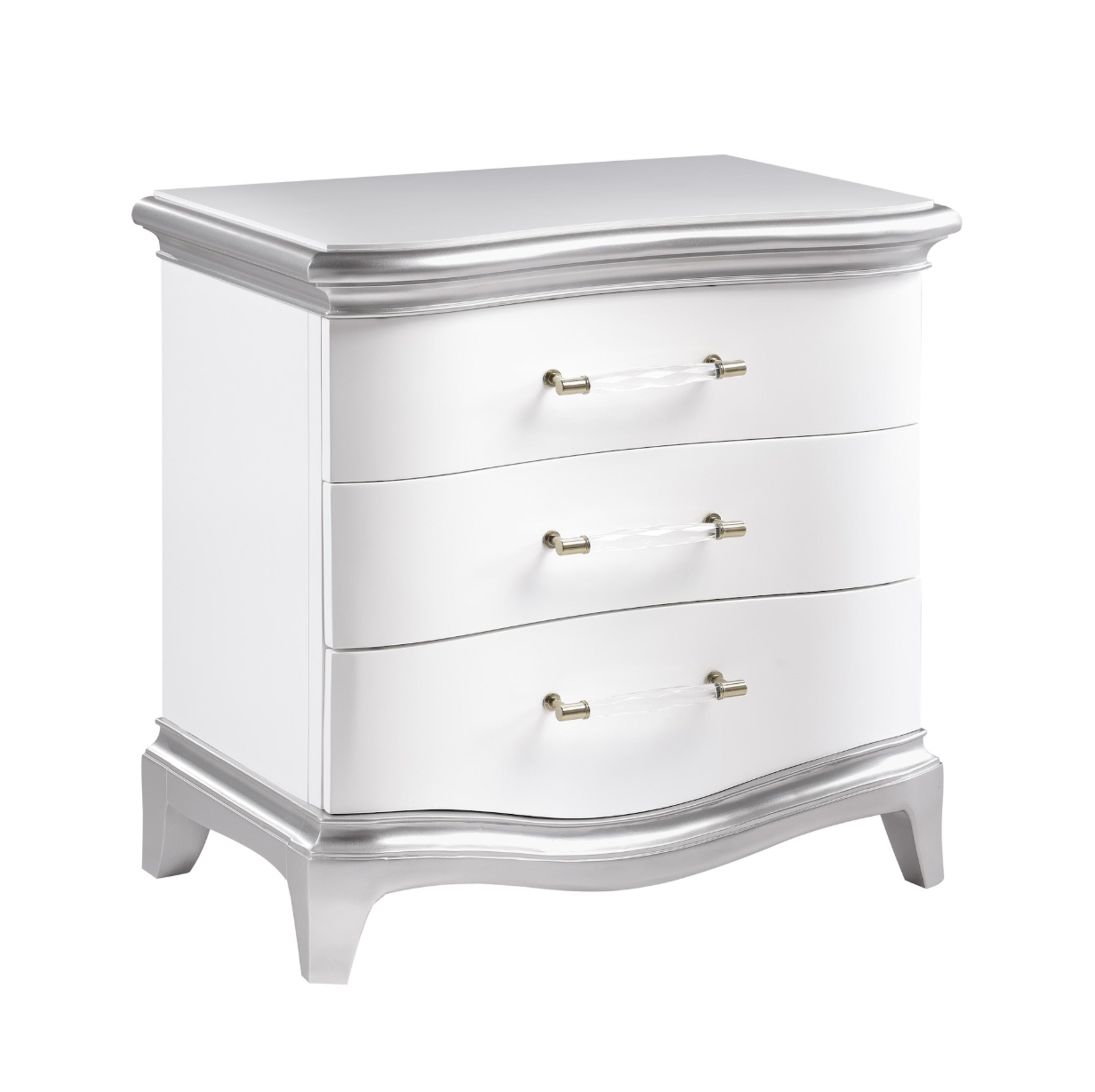 The Nina Bedroom Collection showcases exceptional craftsmanship and attention to detail. The bed features a luxurious, tufted high-back headboard, offering both comfort and visual appeal. Its sleek, white finish is complemented by elegant silver accents along the edges, creating a sophisticated contrast. The nightstand is designed with curved edges and three spacious drawers, accented with modern hardware in a brushed gold tone. The dresser offers ample storage with six deep drawers, providing both style and practicality. The mirror, with its soft, curved edges and silver-trimmed frame, adds a touch of elegance, perfectly complementing the overall design. The entire set is built with high-quality materials, ensuring durability while exuding a polished, contemporary aesthetic.