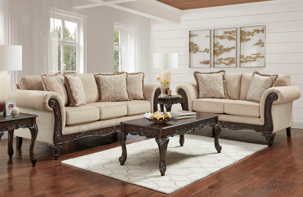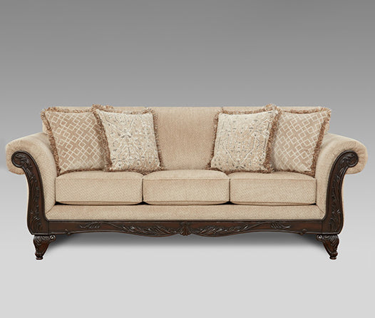 With the Emma sofa, add style and comfort to your home. It is easy to match many types of decoration. Chair seat cushion with rolled arms for comfort and carved dark wood finish.